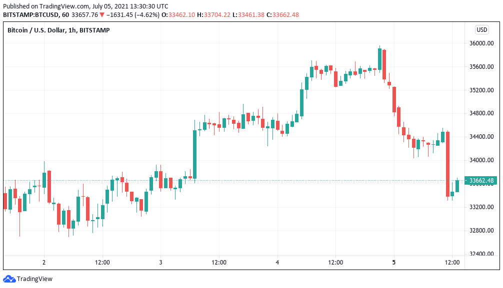 This is exactly what happened — BTC/USD bounced at around $33,300, hovering at $33,600 at the time of writing.