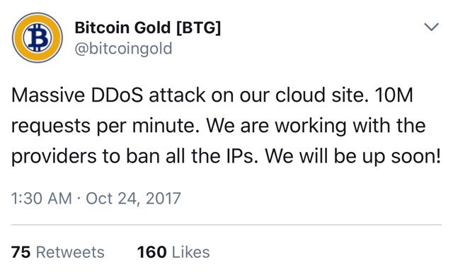 Only hours into its first day live, Bitcoin Gold’s Twitter account announced it had been hit with a distributed denial of service attack (DDoS), forcing its website down for nearly four hours.