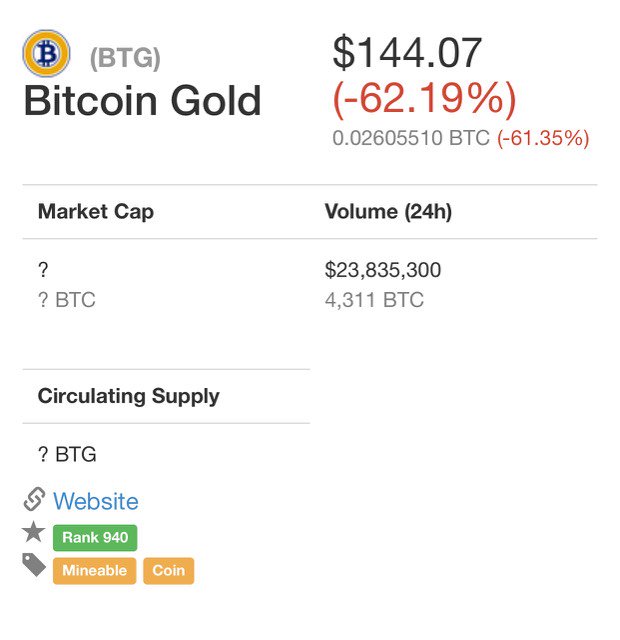 There are no BTG coins to speak of today (except the 100,000 pre-mined coins) nor a blockchain yet, but it trades as a future on the Bitfinex platform. As of this writing, it’s at 104 USD. BTG’s first day, however, Coinmarketcap reported it down over sixty percent.