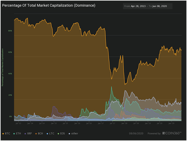 Bitcoin’s dominance in the crypto market remains above 64%, but the top altcoin Ethereum takes up the next largest market share.