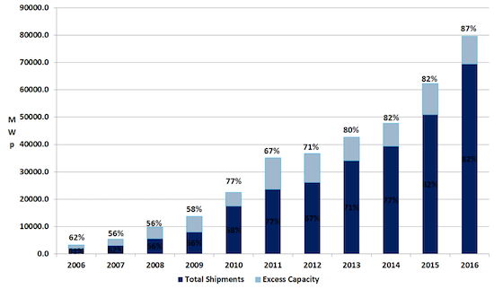 Figure 1 presents global PV shipments and capacity from 2006 through 2016. In 2016, following several years of improvement, the industry had 87 percent capacity utilization. Utilization of >95 percent would be a record over the industry’s 43 years of commercial production.